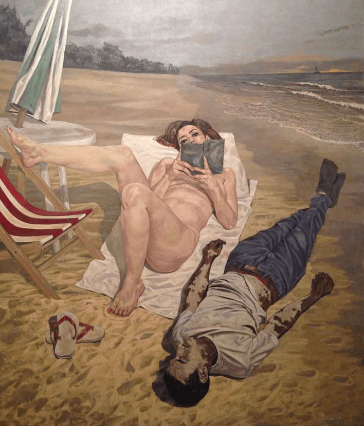 Addressing one of the great moral issues of our time, the refugee crisis in which tens of thousands of unfortunate souls drowned in the Mediterranean, Ebeid commented: “People who feel like strangers in their own countries seeking for a better life in other places where they will realize that they are more strange.” His painting The Immigrant is a kind of shock art, intended to shake us out of complacency. Reversing roles, and expectations, it depicts a fully clothed man (washed up onshore?) lying next to a naked woman at the beach. He is lifeless and discolored, she pale and languid. One of the nudist’s legs is raised, idly—like a cat’s tail twitching on a lazy summer day. It appears that the woman is reading a book, but upon closer inspection, it turns out to be a passport. This is angry, indignant art, laced with defiance and a strange eroticism. But the true obscenity that such a challenging painting suggests is indifference to the pain of Others.