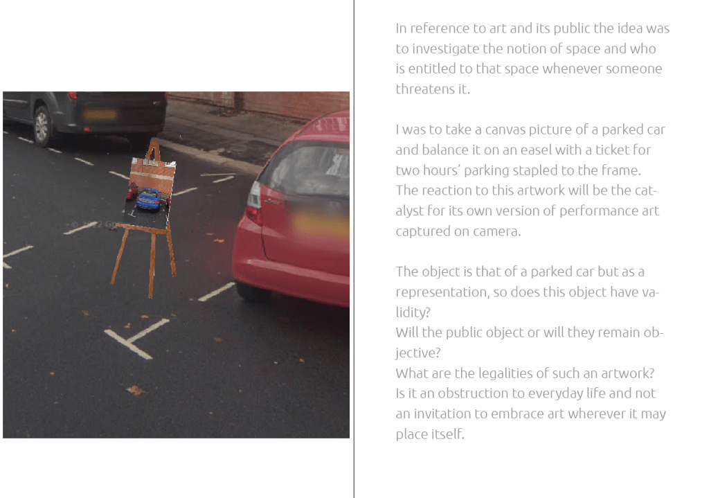 Pecha Kucha October 1st in Aspect Court with other students and our tutor. I spoke in detail about the content on the slides, however it was the parked car performance art that garnered the most interest.