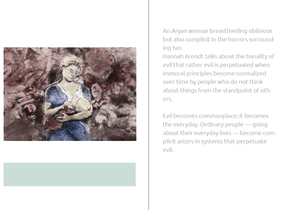The Holocaust is a dominant theme across ‘The Holy Bible’. The decadent death drive of “She Is Suffering”, a rejection of beauty doomed to fade, and the elegiac body horror of “4st 7lbs”; express the dilemma of Richey’s anorexia, mirrored in images of holocaust victims forced into starvation. The author David Evans noted: “Like Sylvia Plath, Richey runs together personal traumas and world-historic tragedies, often in the same lyric.” where she used the image of a “Nazi lampshade” (made of human skin) in her poem Lady Lazarus, Edwards employed lyrics of barking SS men: “Raus raus, fila fila” and sampled of 1945 Nuremberg Trial on ‘Intense Humming Of Evil’, meant to serve as testimonials against Nazi spectacle, they verge on exploitation.