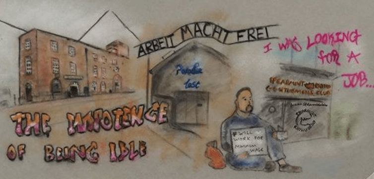 The jobcentre is behind some graffiti that says “the impotence of being idle” a pun on Wilde and how unemployment can deem us useless and powerless.