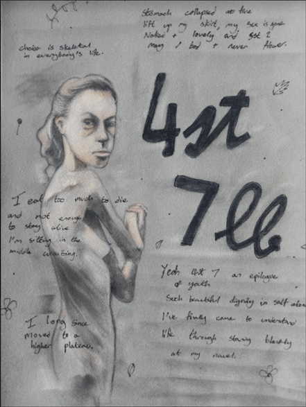I have some ideas of the anorexic woman which I have drawn to be surrounded by either artists in a life drawing class where her suffering has become gestural.