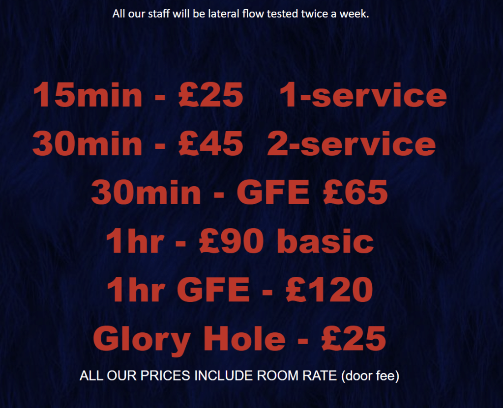 Prostitution is illegal in the U.K. but it still operates and advertises online here is City Sauna with a fetish list: