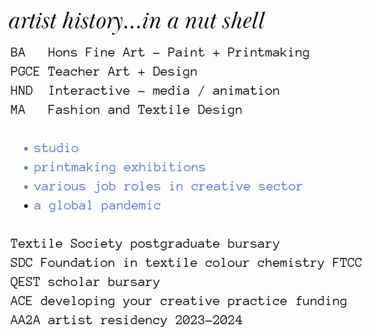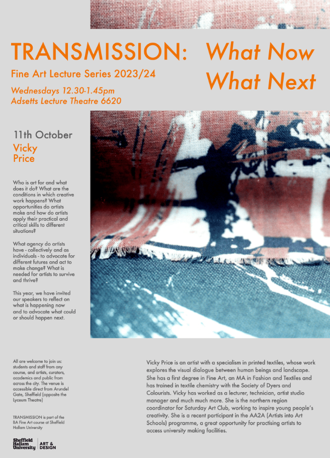 Vicky Price is an artist with a specialism in printed textiles, whose work explores the visual dialogue between human beings and landscape. She has a first degree in Fine Art, an MA in Fashion and Textiles and has trained in textile chemistry with the Society of Dyers and Colourists. Vicky has worked as a lecturer, technician, artist studio manager and much much more. She is the northern region coordinator for Saturday Art Club, working to inspire young people’s creativity. She is a recent participant in the AA2A (Artists into Art Schools) programme, a great opportunity for practising artists to access university making facilities. https://vickyprice.com/ @studiovickyprice
