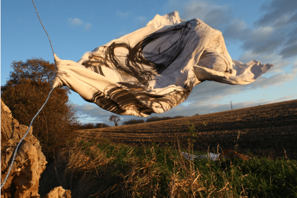 Inspired by automatic drawing, this is a collection of purely waste product installations, using Satin Silk KD515 and Fuji Silk Natural that was damaged or end roll, destined for landfill. The dye is applied using drawing bottles in repetitive physical movements, similar to a human Spirograph. One-off pieces are intended as sustainable research into re-use, used in installations and developed into the series of Flow images, released in the landscape in high wind.