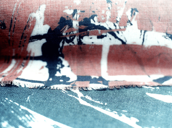An eclectic innovation of hand screen-printed imagery on silks, cottons and linens, based on the concept of drawing in a three-dimensional world. The collection developed initially on a disused jet engine testing site, using waste digital inkjet ink on end rolls of coated fabrics, sourced as unfit for purpose and due for landfill. Bringing her large scale works back into the studio, Vicky continues to re-work the images with found minerals, iron ore, red oxide and metal powders.