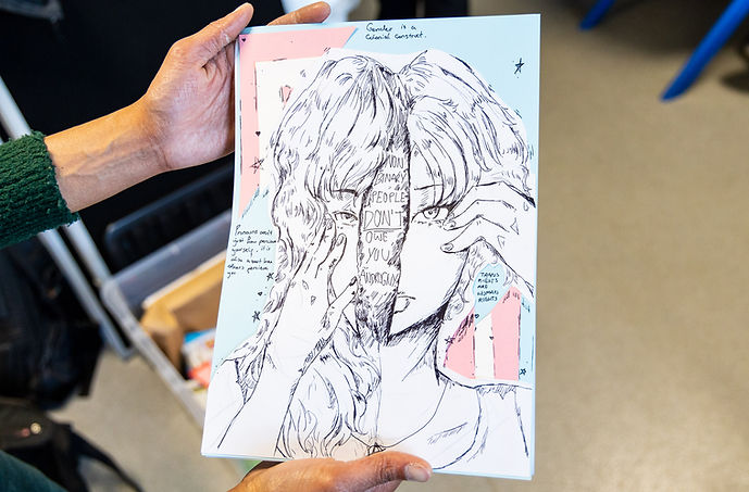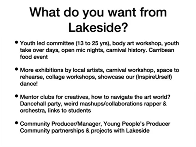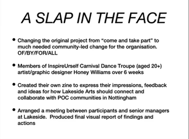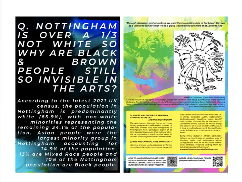 Initiating and producing a creative consultation project & internal report about why Lakeside Arts does not engage and involve people of colour across Nottingham? Members of Inspire Urself Carnival Troupe (aged 20+) worked with artist Honey Williams to create their own zine to express their impressions, feedback and ideas for how the organisation should connect and collaborate with diverse communities.