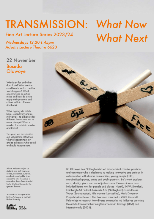 Bo Olawoye is a Nottingham-based independent creative producer and consultant who is dedicated to making innovative arts projects in collaboration with diverse communities, young people (13+), marginalised groups, artists and public partners. Bo’s work explores race, identity, place and social justice issues. Commissioners have included Beam Arts for people and places (North), INIVA (London), Edinburgh Art Festival, Lakeside Arts (Nottingham), Gods House Tower (Southampton), idle women (Lancashire), Mark Devereux Projects (Manchester). She has been awarded a 2023 Churchill Fellowship to research how diverse community led initiatives are using the arts to transform their neighbourhoods in Chicago (USA) and internationally (2024).