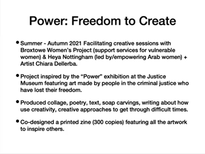 Co-producing a printed zine with Browtowe Women’s Project and Heya Nottingham (Arab women), through a series of interactive conversations. The printed zine captures the women’s creative responses to artwork made by people in the criminal justice system as featured in the “Power” exhibition. A collaboration with artist and curator Chiara Dellerba. Read a copy here.