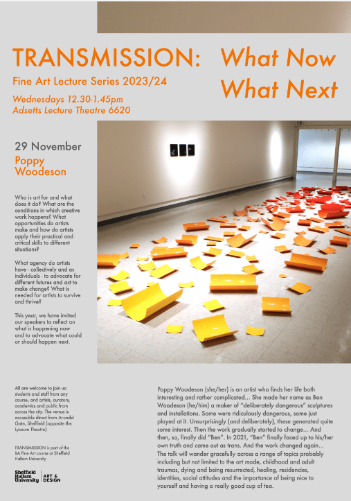 Poppy Woodeson (she/her) is an artist who finds her life both interesting and rather complicated… She made her name as Ben Woodeson (he/him) a maker of “deliberately dangerous” sculptures and installations. Some were ridiculously dangerous, some just played at it. Unsurprisingly (and deliberately), these generated quite some interest. Then the work gradually started to change… And then, so, finally did “Ben”. In 2021, “Ben” finally faced up to his/her own truth and came out as trans. And the work changed again… The talk will wander gracefully across a range of topics probably including but not limited to the art made, childhood and adult traumas, dying and being resurrected, healing, residencies, identities, social attitudes and the importance of being nice to yourself and having a really good cup of tea.