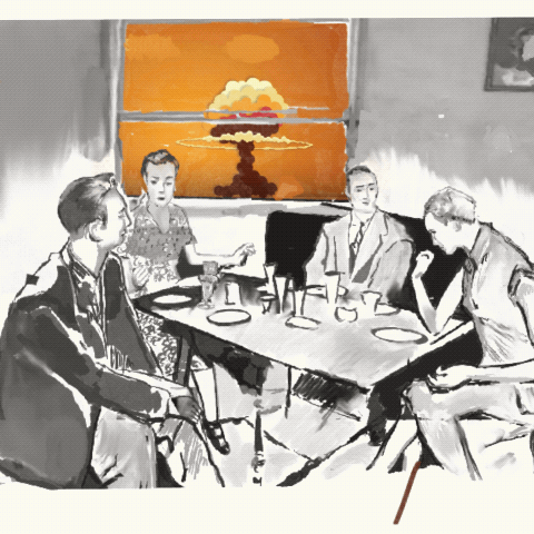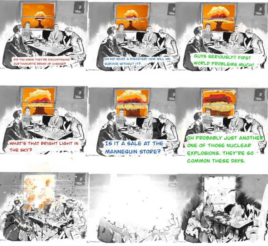 My idea was to create a cartoon using the same panel and a nuclear explosion in the background gradually making its way to the foreground and obliterating everything.
