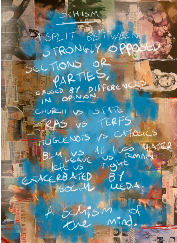 A collage made from newspaper cuttings; Twitter newsfeeds etc. digitally painted overusing Procreate 70 by 50cm original on cardboard.
