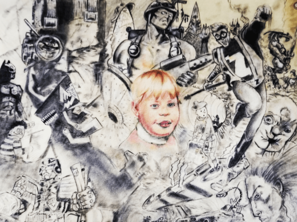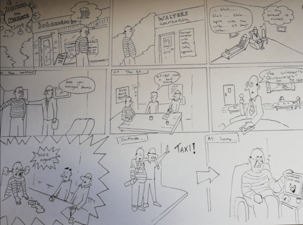 I drew a cartoon strip of Dennis the menace who after bullying his effete friend Walter and losing his dog Gnasher grows up to be unemployed, alcoholic and unable to deal with his temper.