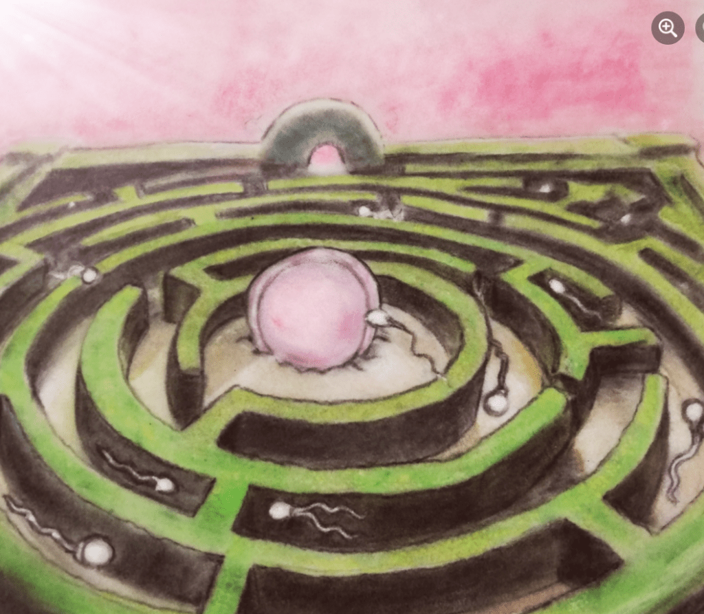 I am drawn towards the idea that conception is a deadly maze with only one winner and that reflects on our nature to be competitive towards one goal; some of us don’t stand a chance such as the two headed sperm which gets lost in the dead end, whilst others cheat and climb over the hedges in an attempt to be victorious at all costs.