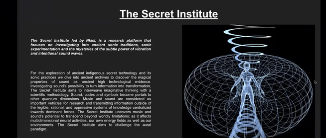 12 October Transmission NKISI (aka Melika Ngombe Kolongo) Nkisi is the alias of Melika Ngombe Kolongo, a musician, artist, DJ, and producer born in the Democratic Republic of Congo and raised in Belgium. Musically, her performances are composed of a captivating cross-talk of African rhythms, uncompromising European hard dance tropes, dark synthesizer melodies and relentless and electrifying energy. She is a co-founder of NON Worldwide, a collective of African and African diaspora musicians, and leads the research platform The Secret Institute focusing on investigating ancient sonic traditions, sonic experimentation, and the mysteries of the subtle power of vibration and intentional sound waves. Her recorded work includes ‘Axis Arkestra’ (2020), ‘Subjective Engine’, R&S Compilation (2020), and ‘Destruction of power’, Collapsing Market (2019). Selected sound design includes the soundtrack for Slim Soledad’s performance ‘Another Map to Nevada’, Performance Agency, Berlin (2020); ‘Sensa’, with Paul Maheke and Ariel Ashbel, performed at Block Universe London UK; ‘Performa19’ at Abrons Art Centre NYC; Ludwig Museum Cologne; Venice Biennial (2019). Nkisi has performed live in venues including Tate Modern, Berlin Atonal, HAU2, and Palais de Tokyo. She curated the Wysing Festival, UK (2017) and a series of events for the Biennale de l’Image en Mouvementin (2018). She is a Resident on NTS Radio. Melika was introduced by Michelle Atherton I will post this link which I think explains Melika's approach and her usage of the name Nkisi also. https://djmag.com/content/nkisi-genre-defying-artist-fusing-trance-inducing-rhythms-african-cosmology Melika introduces the concept of her secret studies of ancient practices connected to trends. Research is rooted into sound as a vibrational device which is labelled as cymatics: