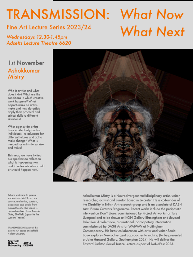 Ashokkumar Mistry is a Neurodivergent multidisciplinary artist, writer, researcher, activist and curator based in Leicester. He is co-founder of the Disability in British Art research group and is an associate of DASH Arts’ Future Curators Programme. Recent works include the peripatetic intervention Don’t Stare, commissioned by Project Artworks for Tate Liverpool and to be shown at IKON Gallery Birmingham and Beyond Relentless Acceleration, a durational, participatory intervention commissioned by DASH Arts for We Are Invisible We Are Visible at Nottingham Contemporary. His latest collaboration with artist and writer Sonia Boué explores Neurodivergent approaches to making (to be presented at John Hansard Gallery, Southampton 2024). He will deliver the Edward Rushton Social Justice Lecture as part of DaDaFest 2023.