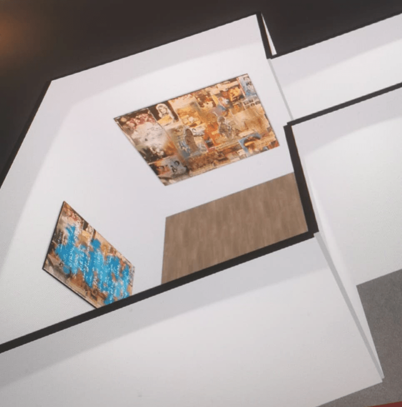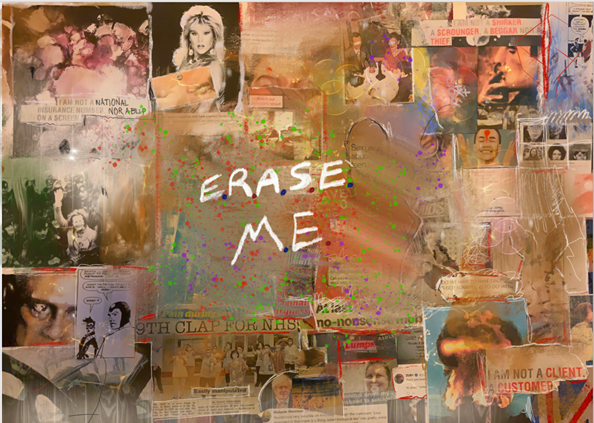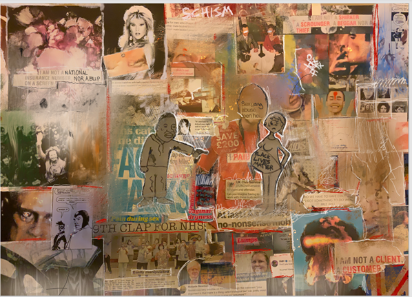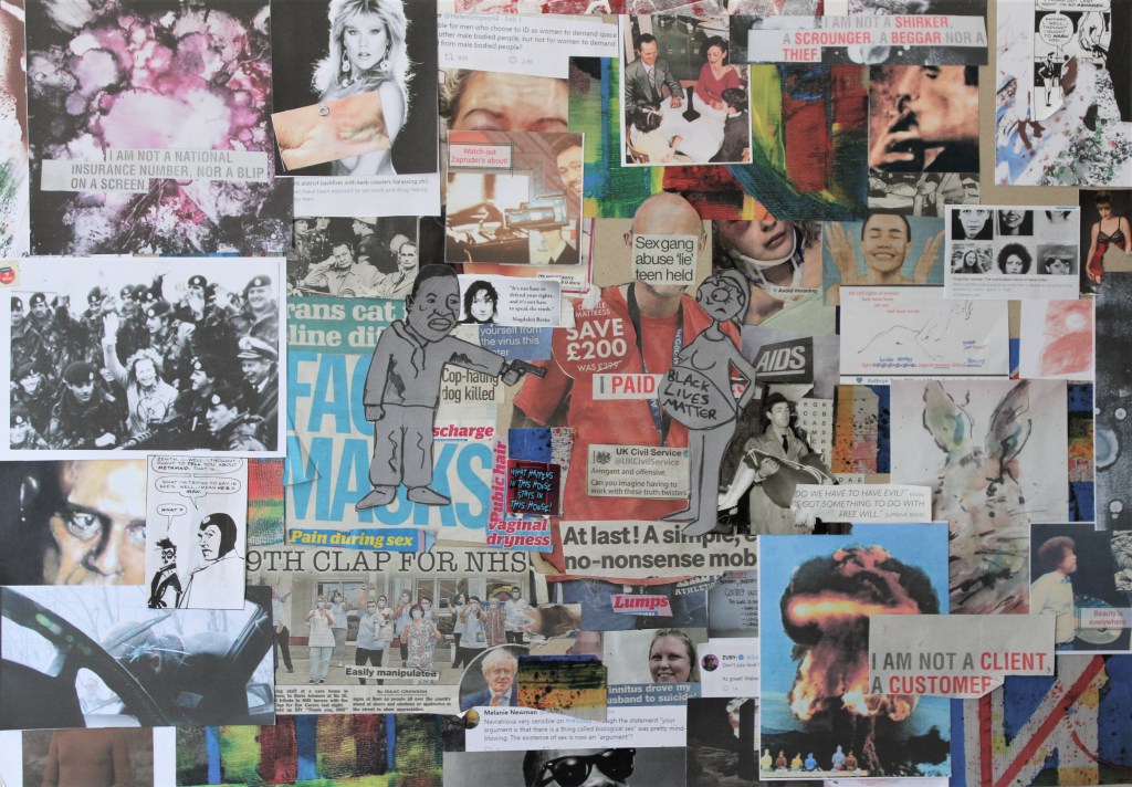 A collage: printouts of Twitterfeeds, Printscreens of YouTube, personal drawings, abstract digital and traditional painting. Clickbait.